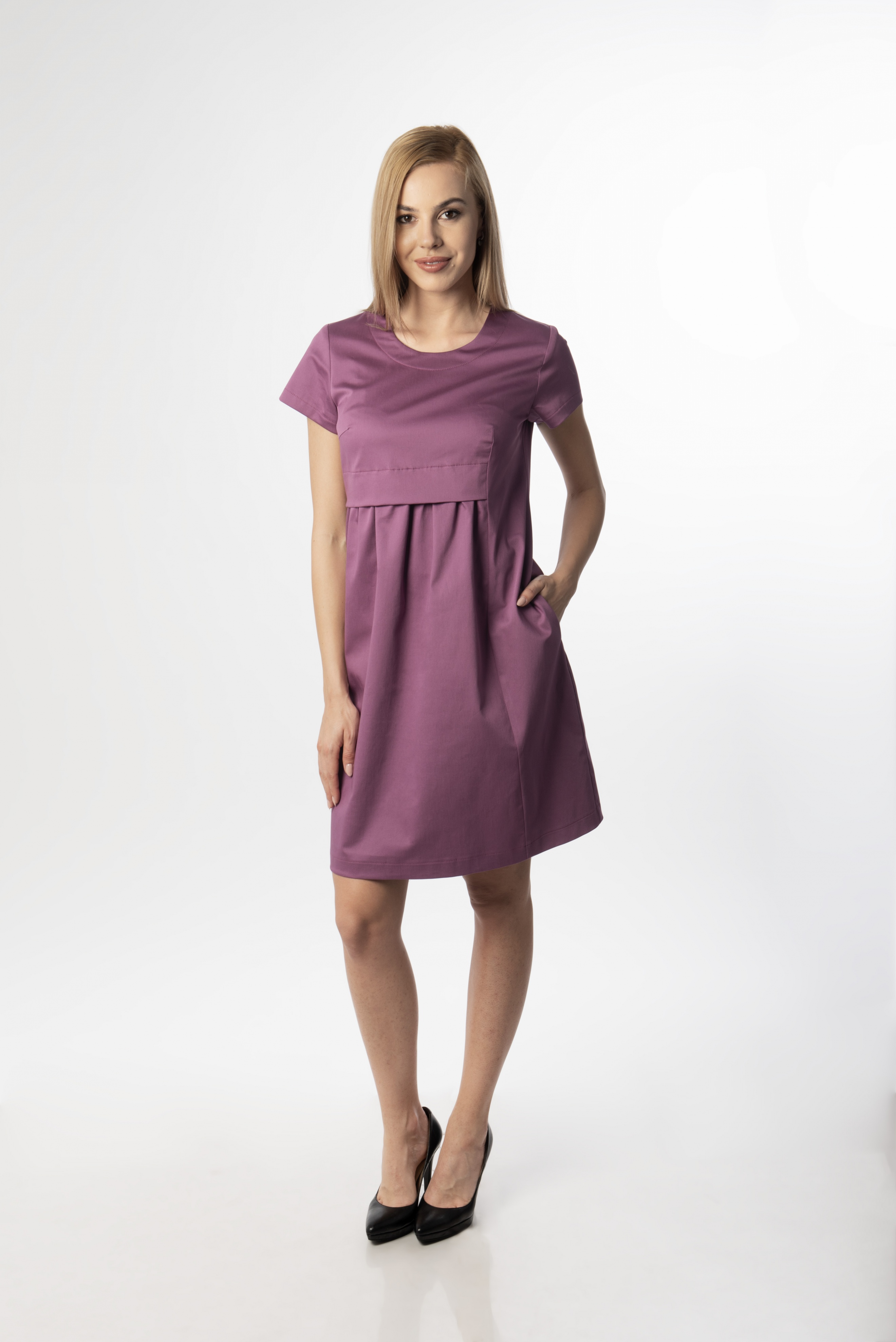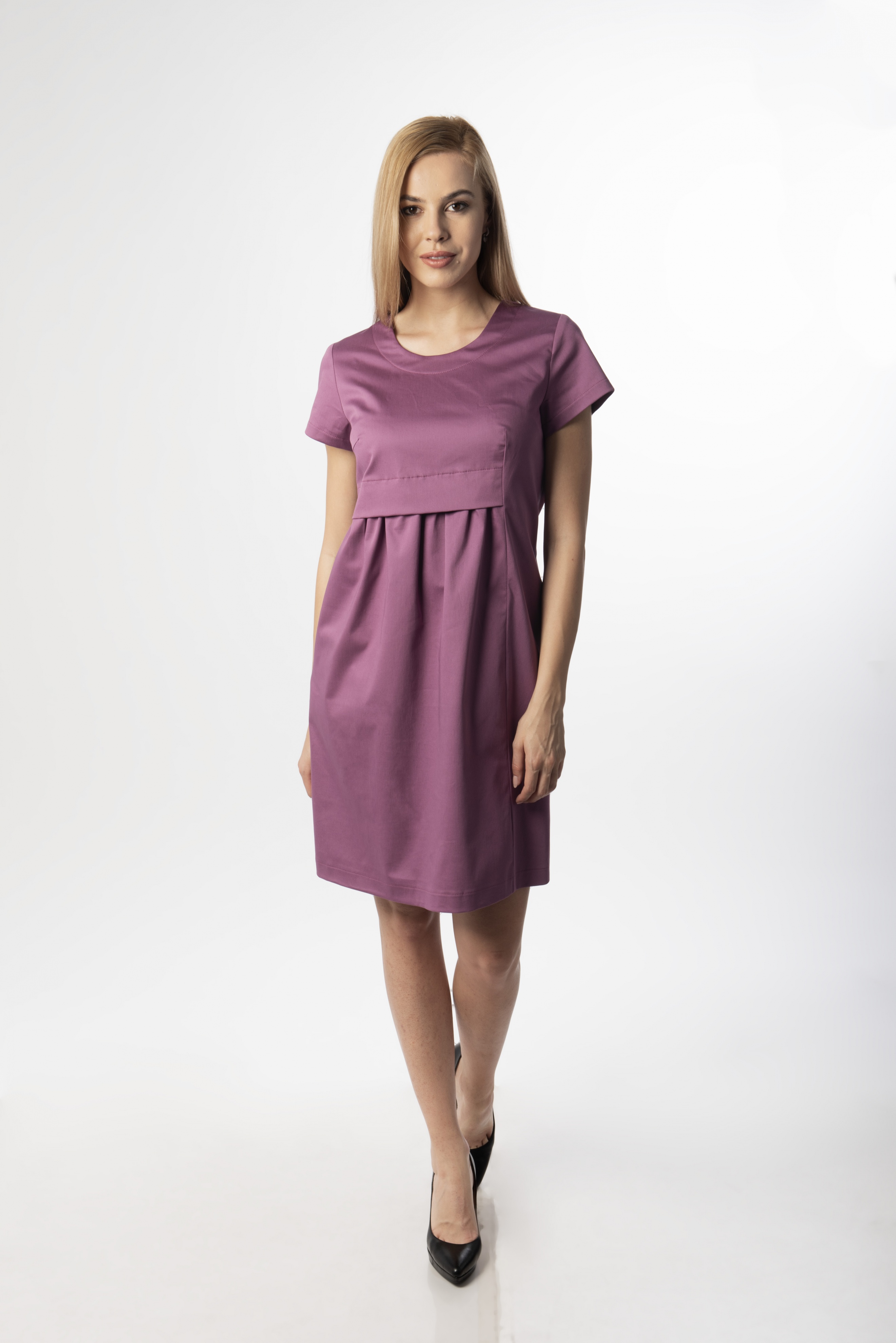 Елегантна памучна рокля с висока талия и къси ръкави в светло лилаво.